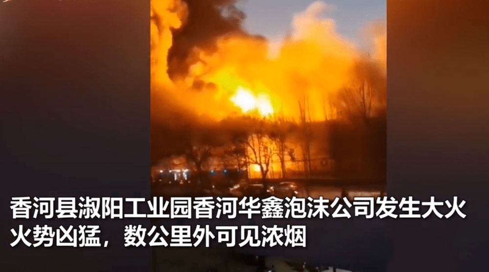 2021年1月6日下午17時許,河北省廊坊市香河縣淑陽工業(yè)園香河華鑫泡沫公司發(fā)生大火。現(xiàn)場火勢兇猛,紅色的火焰竄上數(shù)米高的天空,顯得格外刺眼,濃黑的煙霧在大風加持下,迅速向四周飄散。