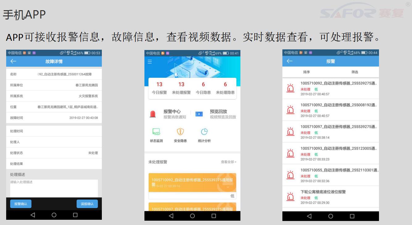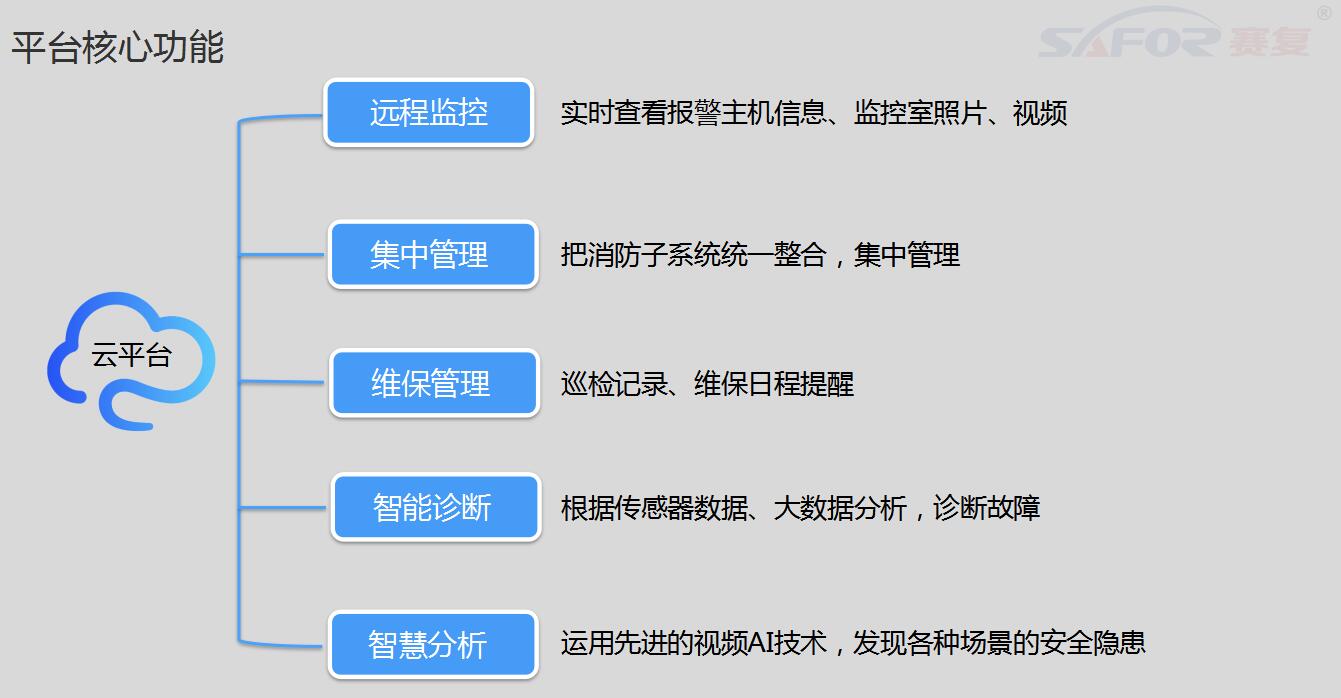 火災(zāi)發(fā)生時(shí),如果能夠在早期及時(shí)發(fā)現(xiàn)火情并報(bào)警,這將大大減小火災(zāi)對(duì)人身安全和財(cái)產(chǎn)所造成的損失。賽復(fù)智能充分利用當(dāng)前正在蓬勃發(fā)展的5G技術(shù)和物聯(lián)網(wǎng)技術(shù),以智能消防炮系統(tǒng)和智能圖像火災(zāi)探測(cè)系統(tǒng)為先鋒,組建智慧消防云平臺(tái),實(shí)現(xiàn)將常規(guī)消防報(bào)警系統(tǒng)、安防監(jiān)控系統(tǒng)等全面接入,實(shí)現(xiàn)新時(shí)代的消防事業(yè)信息化。能夠在三秒發(fā)現(xiàn)火災(zāi),并可實(shí)時(shí)APP云端報(bào)警,真正做到防火于未“燃”。